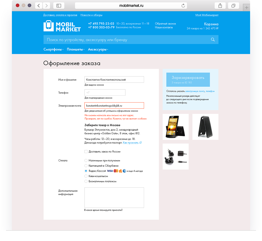 Форма заказа без доставки с ошибкой помогает найти и исправить ошибку, кнопка оформления в этот момент не активна.