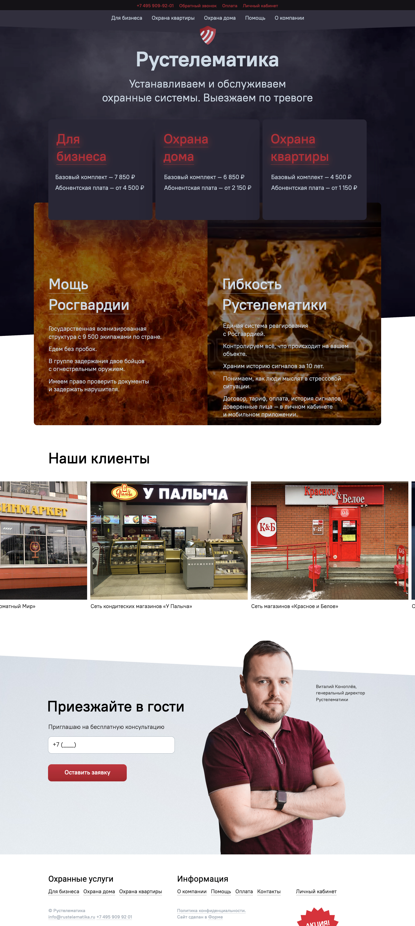 Главная страница встречает посетителя описанием деятельности, ведёт на страницы трёх основных услуг и рассказывает о ключевом преимуществе Рустелематики — сотрудничестве с Росгвардией.