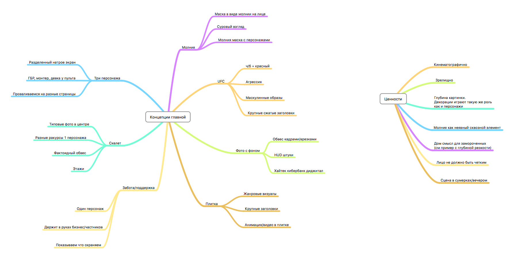 Проводим несколько сессий с заказчиком и его управляющим партнёром. Обсуждаем возможные концепции позиционирования компании. Ищем, от чего оттолкнуться. Расспрашиваем, что рассказывают продажники компании на встрече с клиентами.